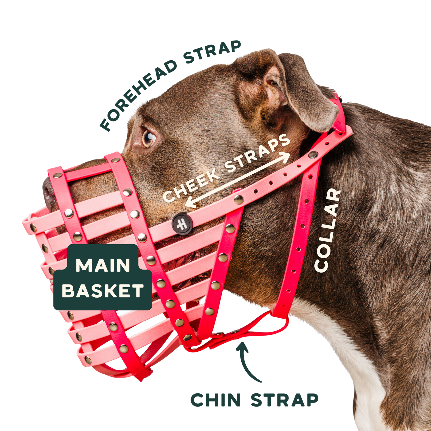 • Chin strap — adds stability under the muzzle.