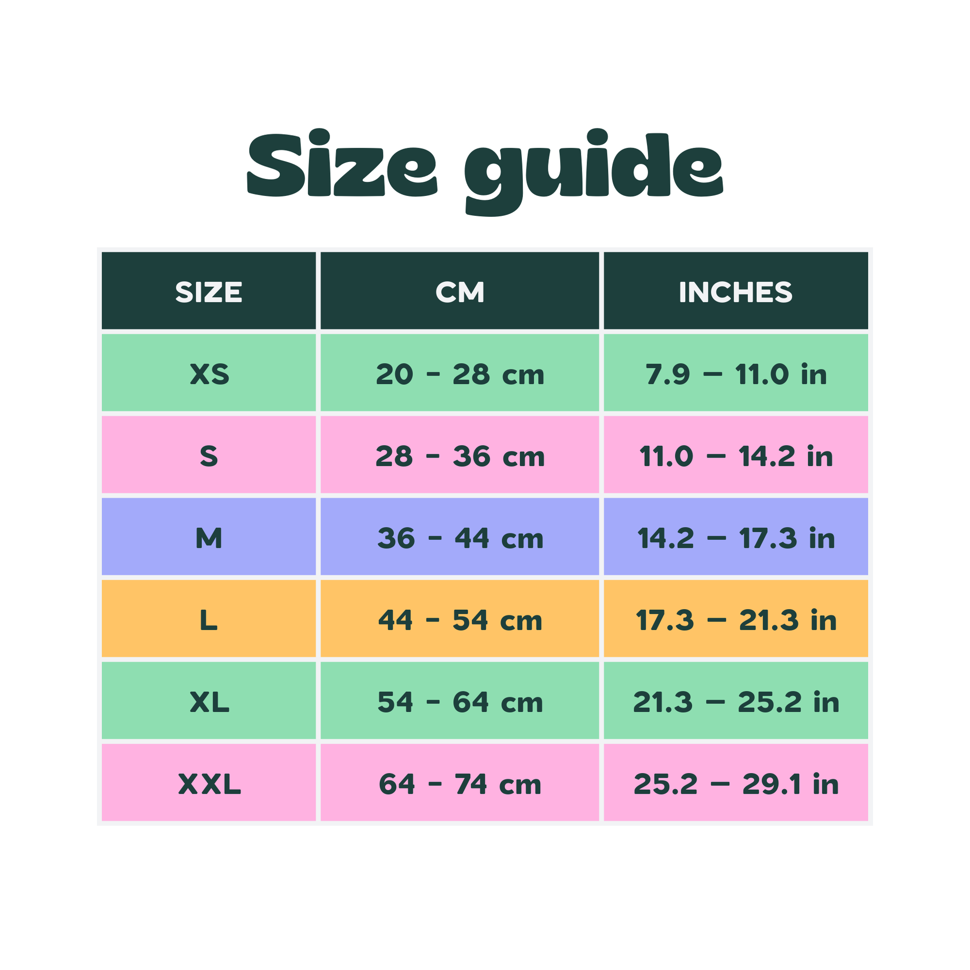 XS = 20–28 cm (7.9–11.0 in) – 13 mm wide