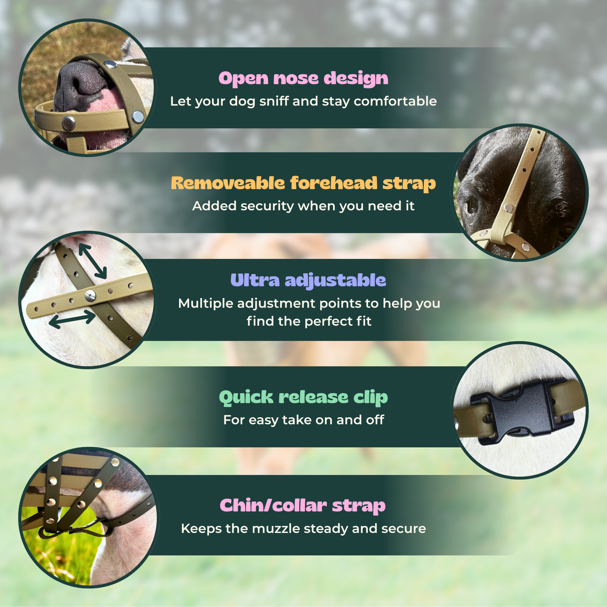 We’re so glad to have found a muzzle that works for him and lets him carry on being him!