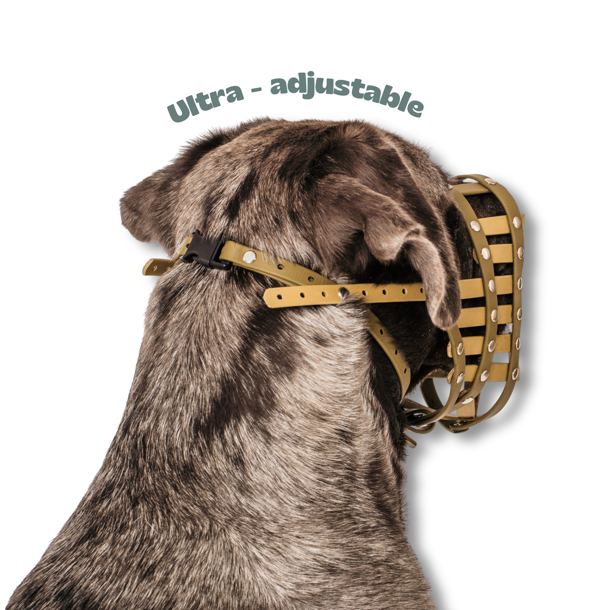 With rust-resistant stainless steel fixings and an ultra-adjustable fit in 3 areas (neck, chin, and crown), this muzzle gives a secure fit while still allowing your dog to pant and drink water safely.